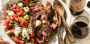 - To serve, slice the steak widthways and plate with the Watermelon Salad on large platter and a slightly chilled glass of Shiraz.